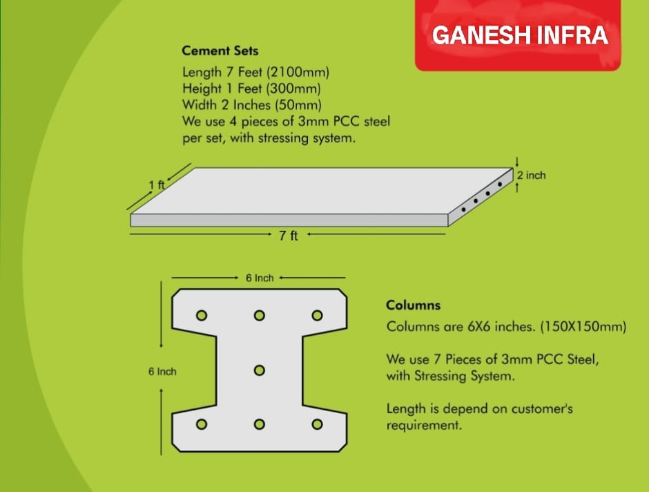 Our vertical concrete posts and horizontal cement planks are crafted using advanced prestress technology, ensuring unmatched strength and long-lasting performance. Each component is reinforced with high-quality HTC steel rods and molded using a specially engineered concrete mix.